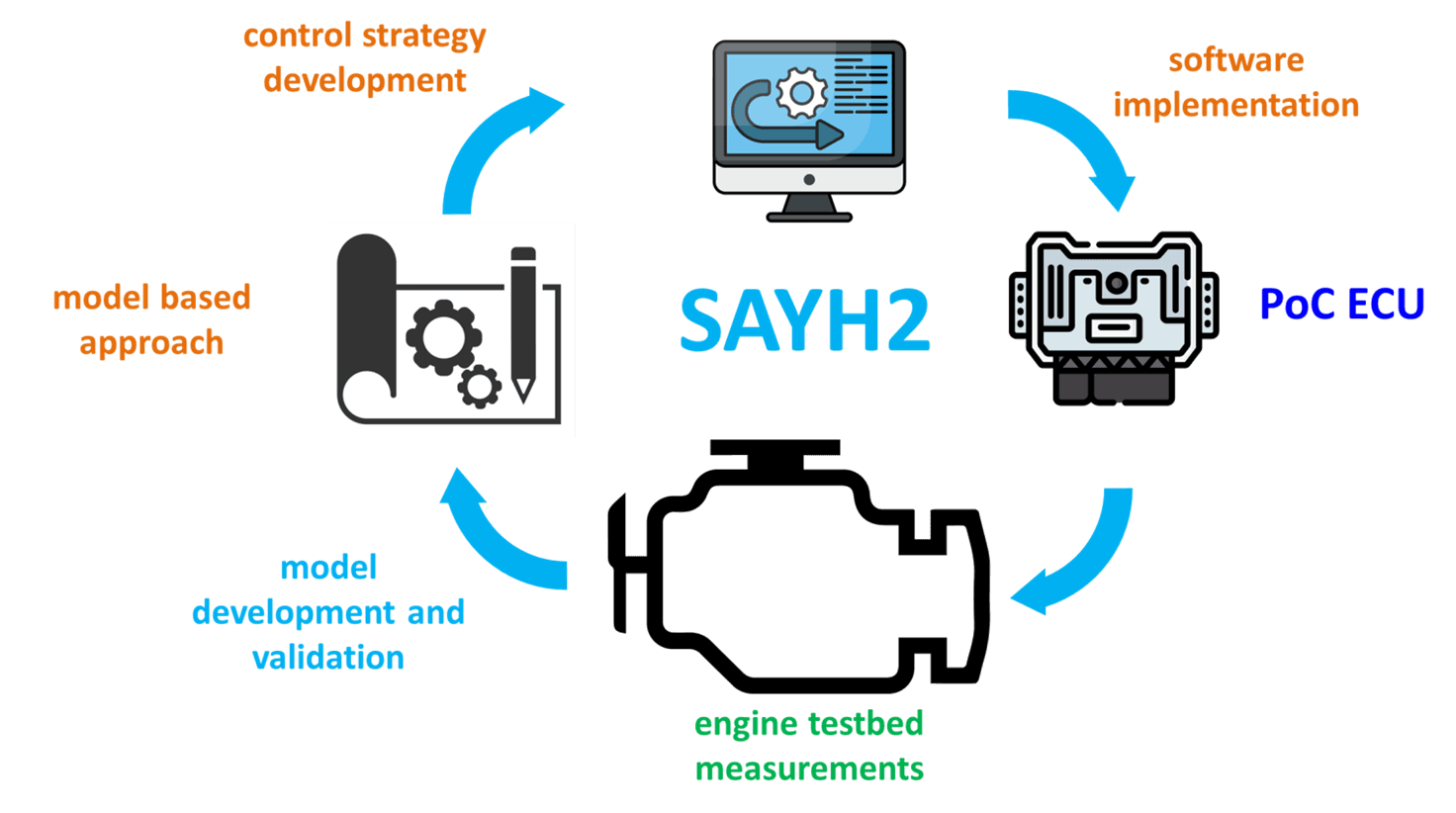 SAYH2 ha formulato il concetto di controllo della fasatura della scintilla da cilindro a cilindro e ha dimostrato con successo miglioramenti in termini di efficienza attraverso l'implementazione software-in-the-loop. La proposta iniziale di integrazione diretta del software è stata completata con un nuovo concetto che implica l'aggiunta di un modulo di controllo dedicato con funzionalità plug-and-play; in questo modo il mercato potenziale è stato ulteriormente ampliato con lo sviluppo di tipologie di prodotto retrofit.